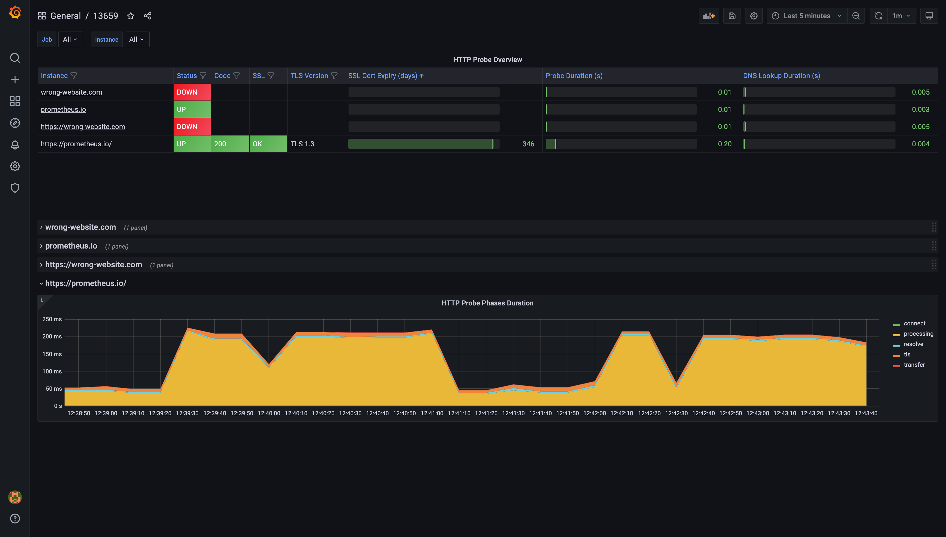 This process adds a dashboard designed for Blackbox Exporter data visualization. Use the Job selector at the top left to focus on specific instances.