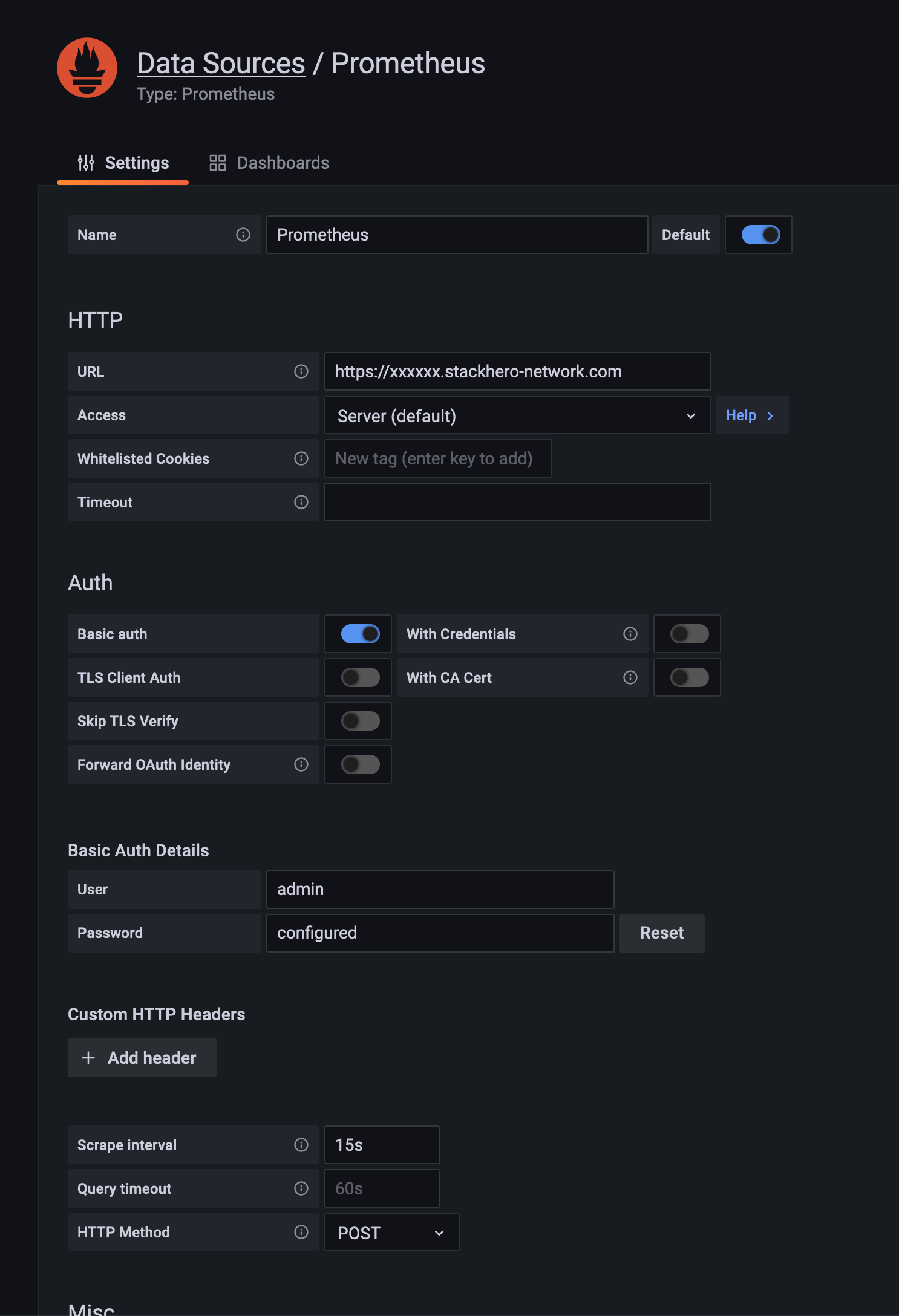 • URL: Provide the Prometheus service URL, such as https://<XXXXXX>.stackhero-network.com or your custom domain.