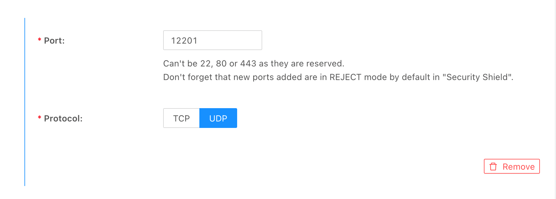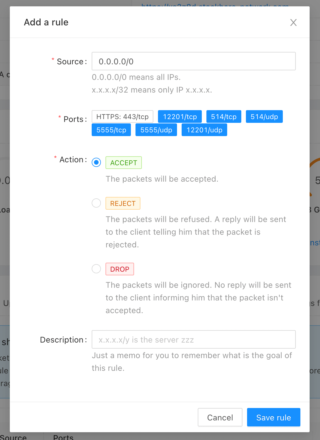 Firewalltab. - Ensure there is a rule accepting traffic for the input port and protocol. If you want to allow any IP, set the IP field to