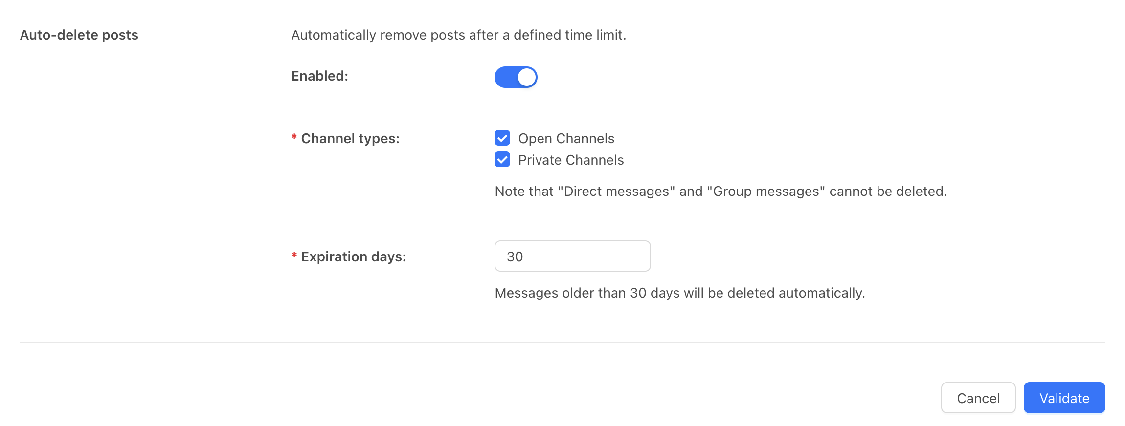 Mattermost messages auto deletion configuration