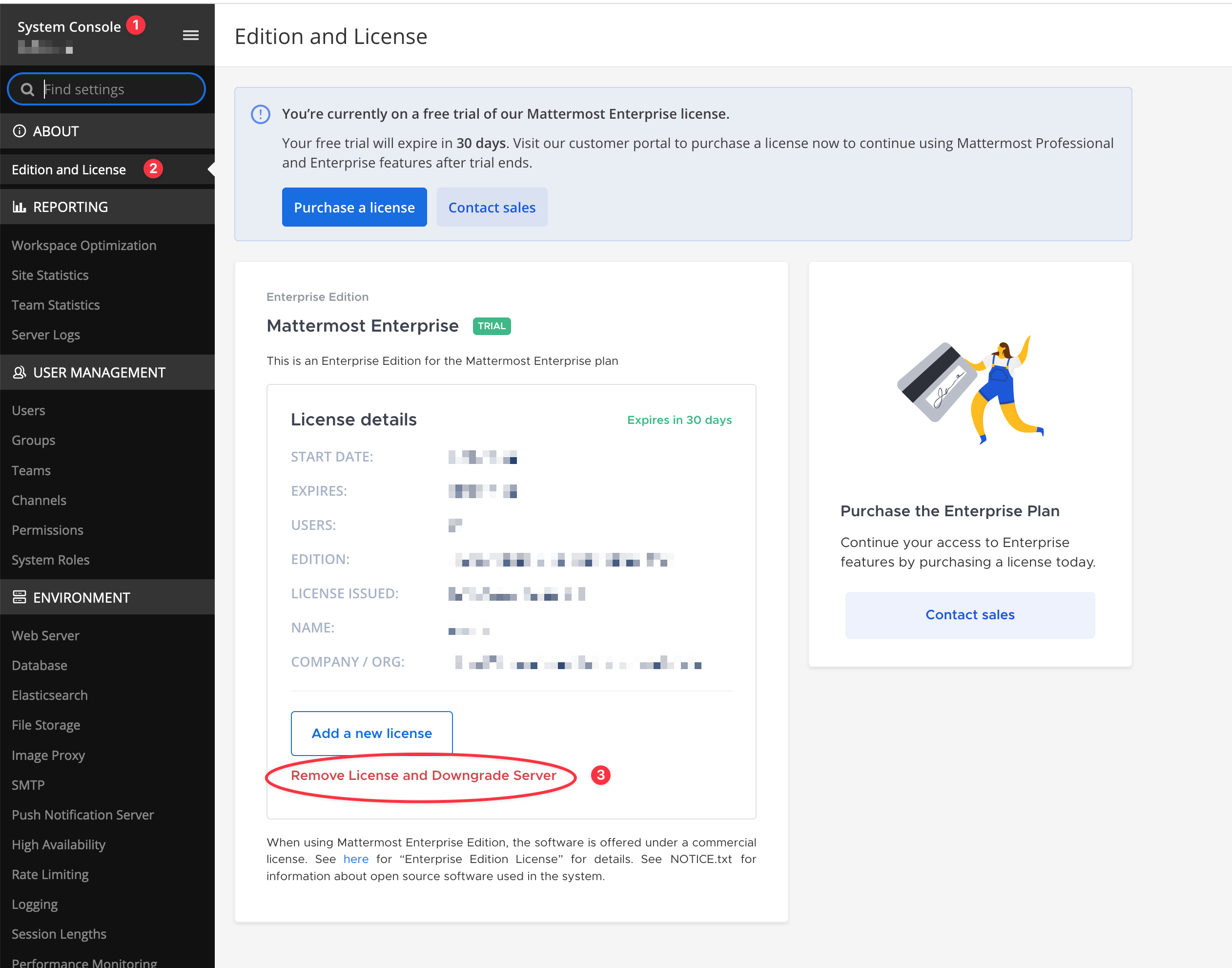 Log in to Mattermost, click the menu icon at the top left, select System Console, then Edition and License. Finally, click Remove License and Downgrade Server.