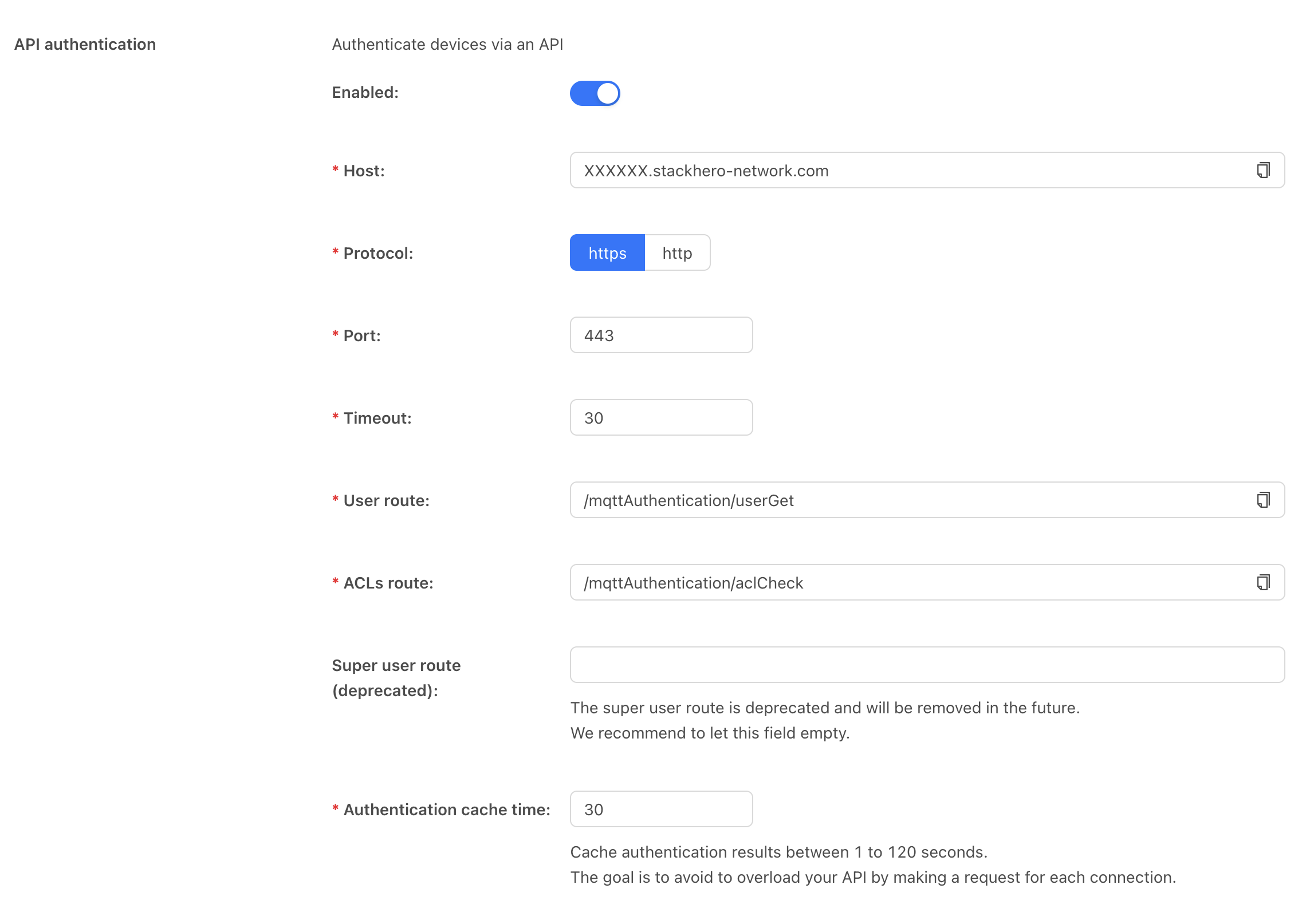 5. Specify the ACLs route as /mqttAuthentication/aclCheck.