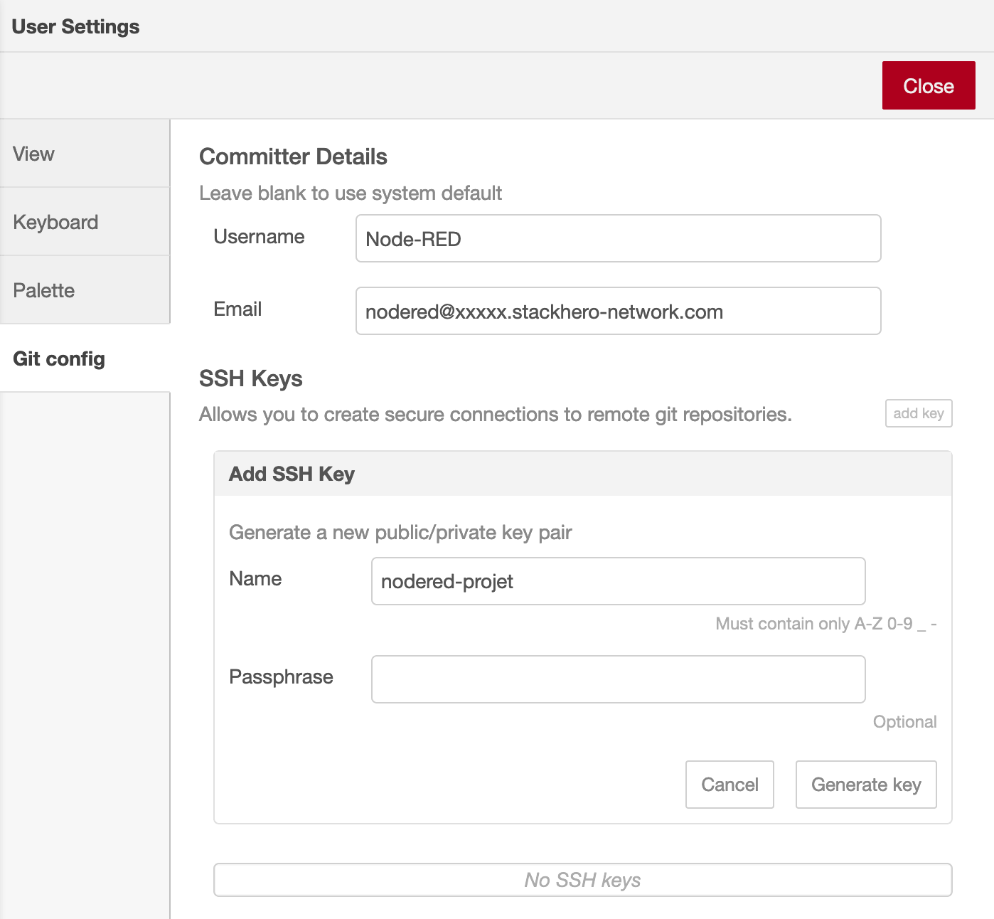 In the "Committer Details" section, provide your Git username and email address. These details associate your Git commits with your identity. For consistency, you might choose Node-RED as the username and use an email format like nodered@xxxxx.stackhero-network.com, replacing xxxxx.stackhero-network.com with the domain of your Node-RED instance.