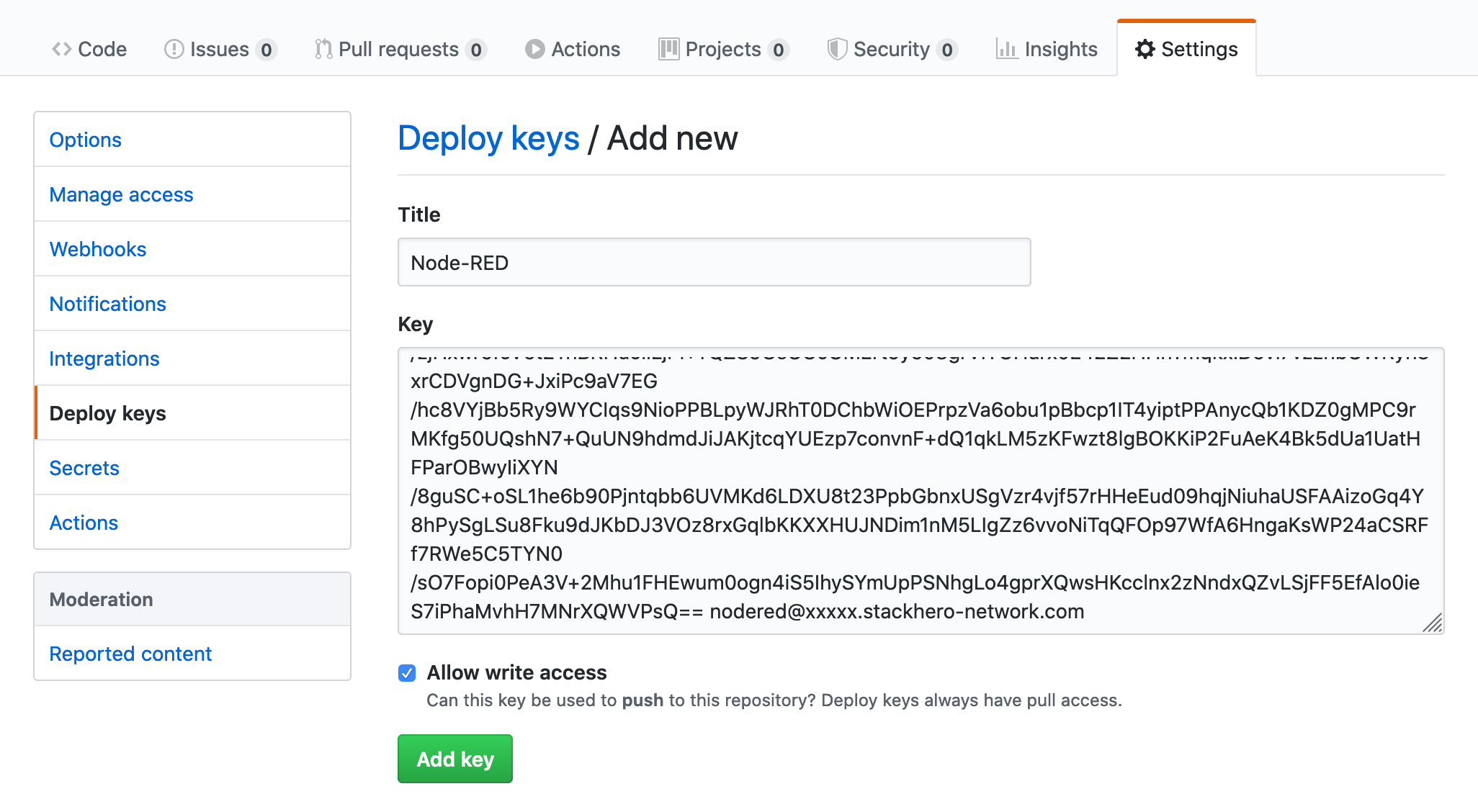 You can create a new repository or use an existing one. In GitHub, navigate to your repository, click Settings, then Deploy keys, and select Add deploy key. Paste the public key you copied earlier, assign it a descriptive name like "Node-RED", check the Allow write access box, and click Add key.