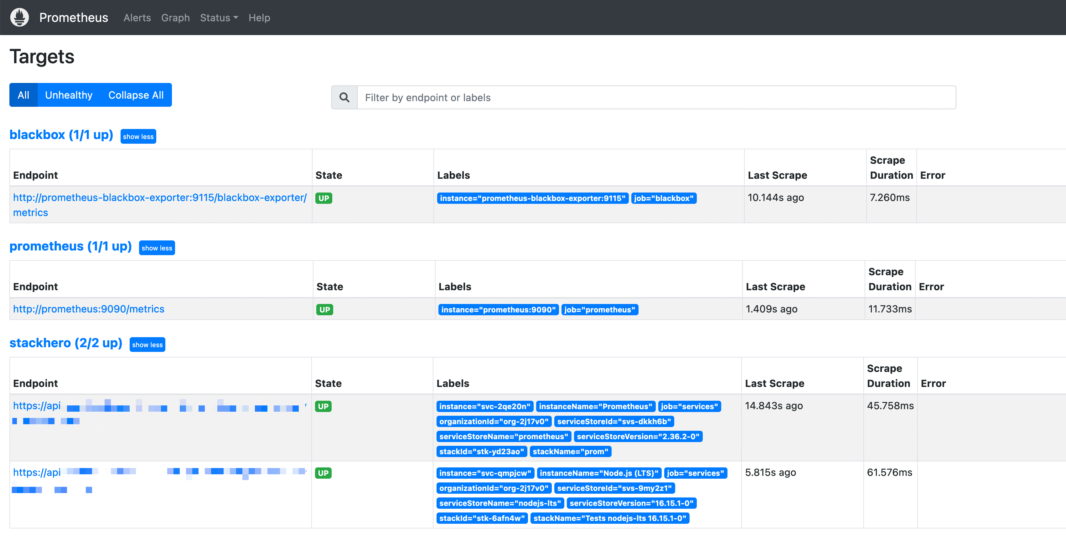 Next, go to Status > Targets. You should see one endpoint for each Stackhero instance.