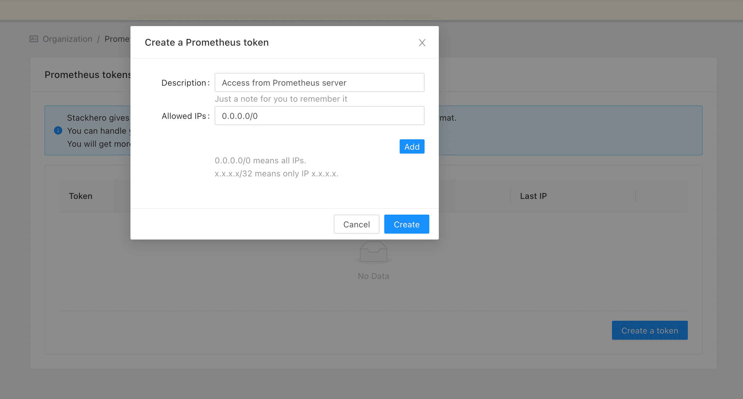 Prometheus token creation in the Stackhero dashboardPrometheus token creation in the Stackhero dashboard